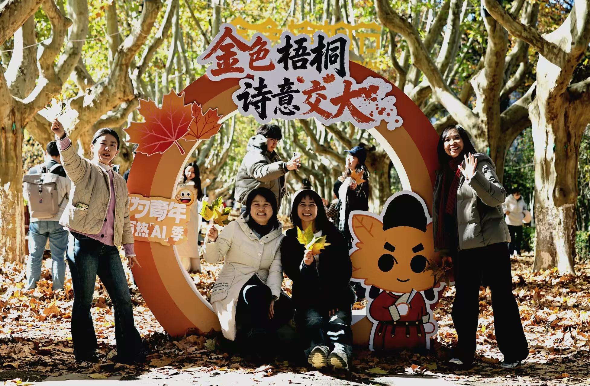 漫步兴庆校区梧桐大道,阳光透过枝叶洒下斑驳光影,脚下的落叶铺成柔软的金色长廊。同学们三三两两并肩而行,或在树下浅笑合影,或拾起一片落叶夹进书页,把这份独属于交大的冬日限定浪漫藏进记忆。除了标志性的“金色梧桐道”,本次梧桐节还精心打造了八大主题景观展——“落叶留言板”上写满真挚寄语,“梧桐有你”打卡点定格温馨瞬间,“萌趣小梧桐”景观则让校园多了几分俏皮灵动。