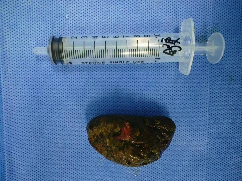 更惊险的是,治疗期间曾阿姨病情突然恶化,出现腹腔积液症状。普外科李兵主任医师、武永强主任医师、杨攀主治医师组成的医疗团队第一时间启动紧急手术,术中竟从其肠道内取出一枚比鸡蛋还大、坚硬如石的“柿石”。“这枚柿石死死卡在小肠里,就像高速路上的巨石挡道,直接导致肠道‘交通瘫痪’,若不及时手术可能引发更严重的并发症。”李兵主任医师形象地解释道。