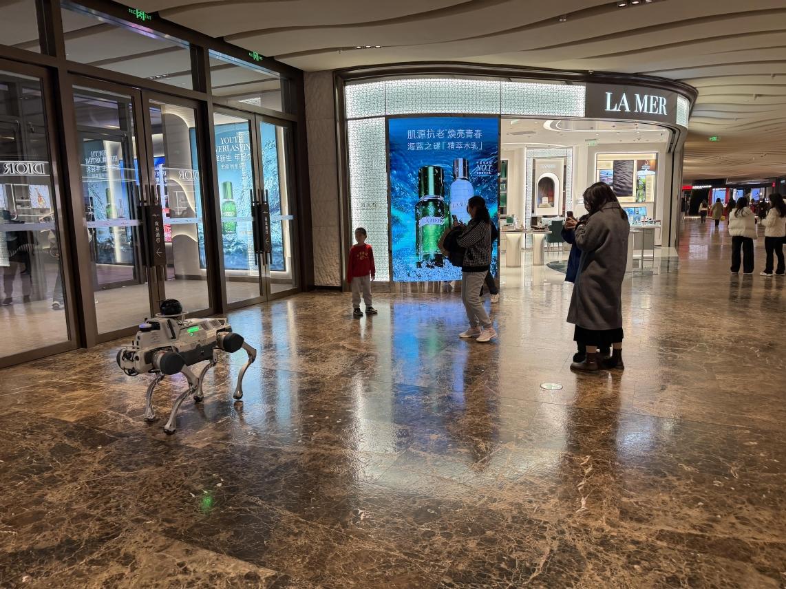 这只机器狗不仅能平稳穿梭在熙攘人流中,灵活完成“奔跑”“下蹲”“避障”等动作,遇到好奇围拢的孩子还会主动停下脚步,互动感十足。“第一次在商场见到这么智能的机器狗,反应特别灵敏,太稀奇了!”市民王先生特意带孩子前来打卡,对机器狗的表现赞不绝口。这只集科技感与互动性于一身的机器狗,已然成为商场里一道独特的科技风景线,刷新着消费者的购物体验。