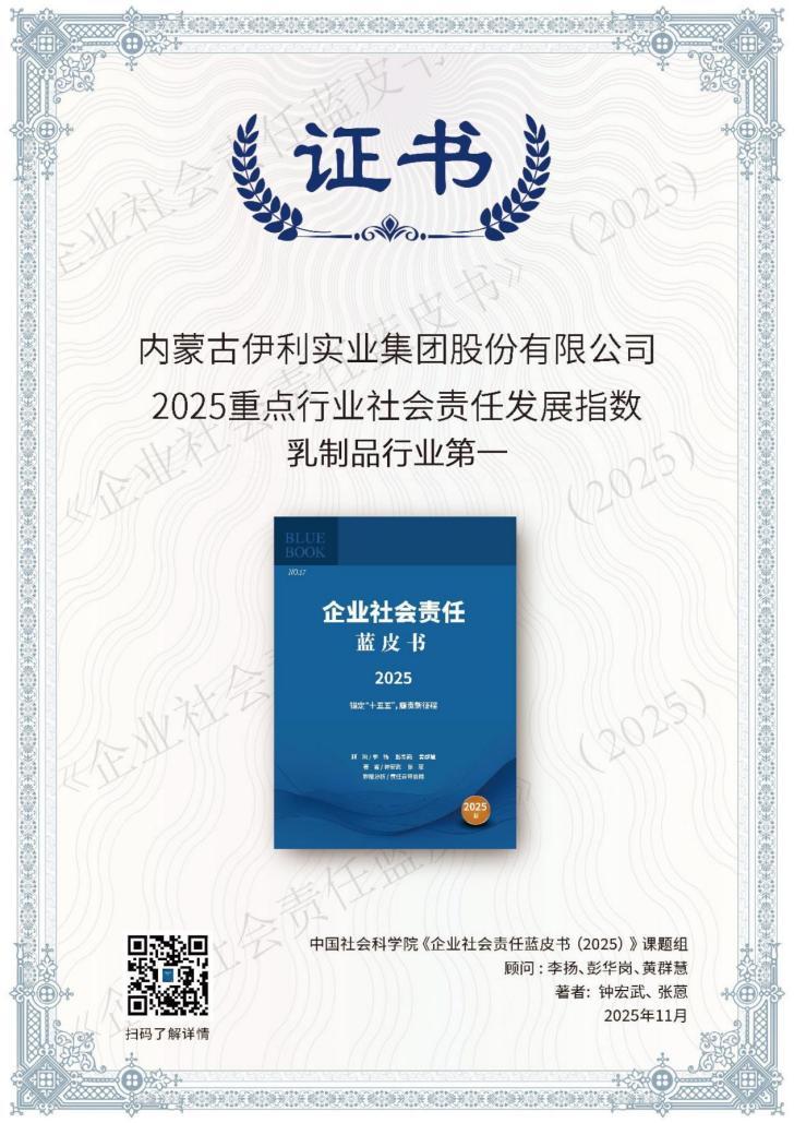 《企业社会责任蓝皮书(2025)》由中国社会科学院编制,已连续发布17载,其创新构建的“中国企业社会责任发展指数”,已成为评价大企业社会责任管理与信息披露水平的权威标尺,成为企业社会责任领域具有权威性和影响力的评价成果。作为行业龙头企业,伊利第8次荣获乳制品行业社会责任发展指数第一,是权威学术机构中国社科院对伊利主动践行ESG理念的再次肯定,更是伊利将可持续发展转化为核心竞争力的有力佐证。伊利以核心能力驱动社会价值创新,推动商业价值与社会价值“两价融合”,践行“共创价值、共享美好”的愿景,实现社会价值的“共创、共益、共享”。