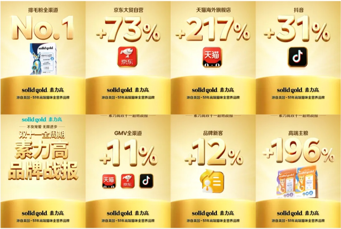 在双十一购物节期间,Solid Gold素力高电商GMV全渠道实现同比增长11%,新客同比增长12%。旗下高端主粮同比增长196%,排毛粉更强势霸榜全渠道No.1。此外,京东大贸自营销售实现同比增长超73%;天猫海外旗舰店销售同比增长217%;抖音渠道销售同比增长31%。