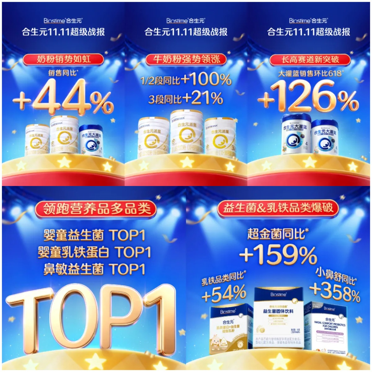 2025年双十一期间,合生元持续深化“奶粉+营养品”双轮驱动,构筑全方位婴童营养体系,全渠道GMV实现显著提升37%,创历史新高,稳居婴童营养行业领跑阵营。