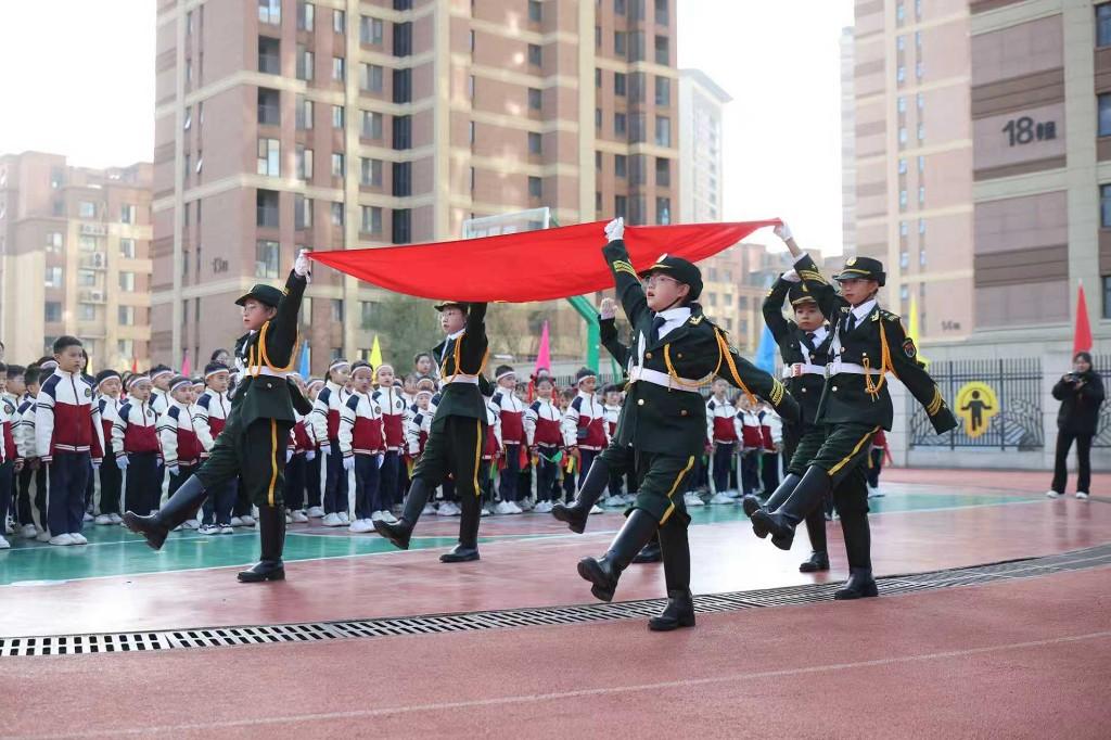 开幕式在庄严的升旗仪式中拉开序幕。伴随着雄壮的国歌声,五星红旗冉冉升起,全体师生及嘉宾肃立行礼,表达对祖国的无限热爱与崇高敬意。随后,陕西师范大学浐灞国际港实验小学执行校长丁仕进发表热情洋溢的开幕词。他表示,学校自开学以来,紧密依托陕西师范大学优质教育资源,秉承“为每一个学生的发展提供适合的教育”的办学理念,全力构建德、智、体、美、劳全面培养的教育体系。此次队列广播操比赛暨三跳运动会,既是对学生身体素质的检阅,也是学校文化和班级文化建设的有力体现。他鼓励每一位运动员和班级以饱满的热情投入比赛,赛出风格、赛出成绩,尊重规则、尊重对手,同时希望同学们在比赛中享受运动乐趣,增强集体凝聚力与战斗力。