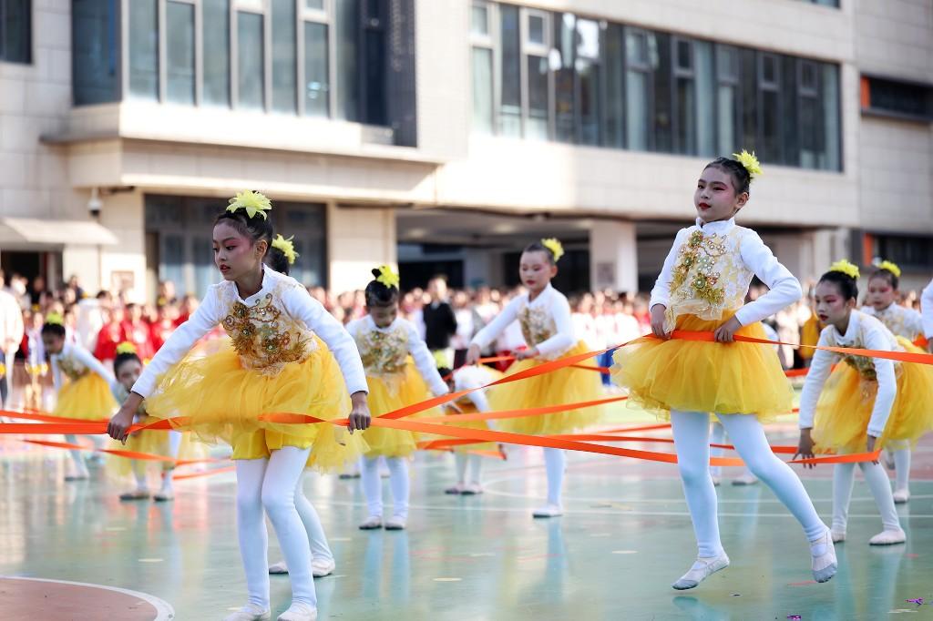 除紧张激烈的体育比赛外,开幕式上的节目表演同样精彩纷呈。低年级和高年级的皮筋舞表演将跳跃力量与舞蹈完美融合,小小皮筋在同学们脚下变幻出无数花样,每一个动作都凝聚着汗水与默契。跳绳表演队的同学们则带来热血沸腾的绳舞盛宴,小绳灵动舞出个人风采,大绳豪迈彰显团队担当。