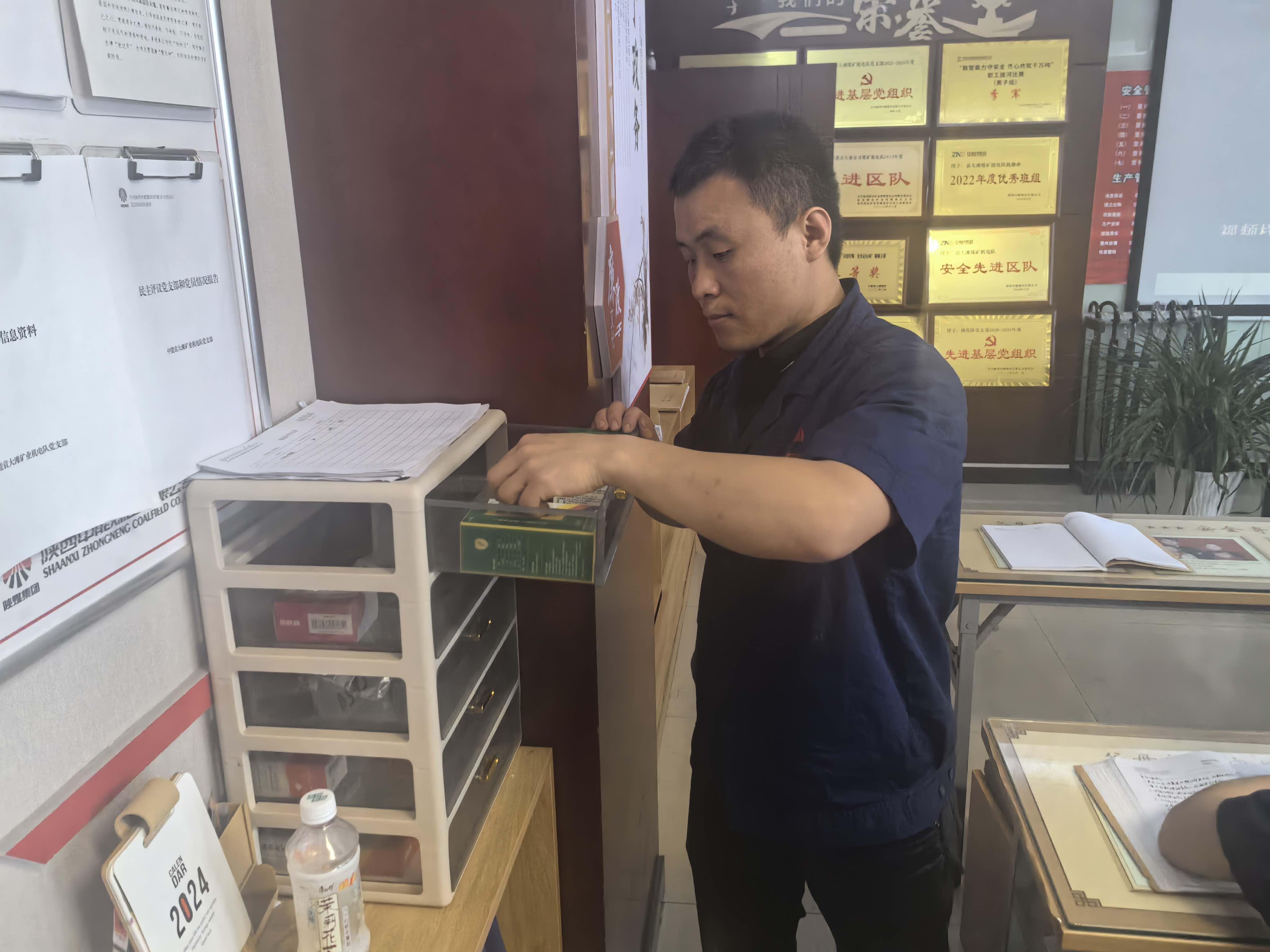 针对煤矿井上天气多变,机电队在学习室内设置“共享雨伞角”,职工登记即可免费使用、用完归还。同时,设立爱心药箱,创可贴、感冒药、肠胃药、防暑药等常用药品,均标注使用说明和有效期。为让药箱发挥实效,区队指定专人负责日常管理与补充,定期盘点库存、更换过期药品,确保职工用得安全放心。