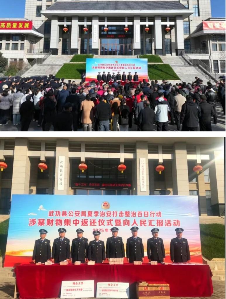 三秦都市报-三秦网讯(王维 弓伟斌)为全面展现2025年夏季治安打击整治百日行动取得的成果,有力地震慑违法犯罪行为,及时返还损失财物,提升人民群众的安全感和获得感,11月20日,咸阳市武功县公安局举行2025年夏季治安打击整治百日行动涉案财物集中返还仪式暨向人民汇报活动,武功县公安局党委副书记、政委赵江,县公安局党委委员杨智、韩显刚等领导同志,各科所队负责同志和民辅警代表,部分两代表一委员和群众代表参加了大会。
