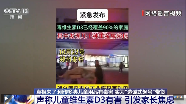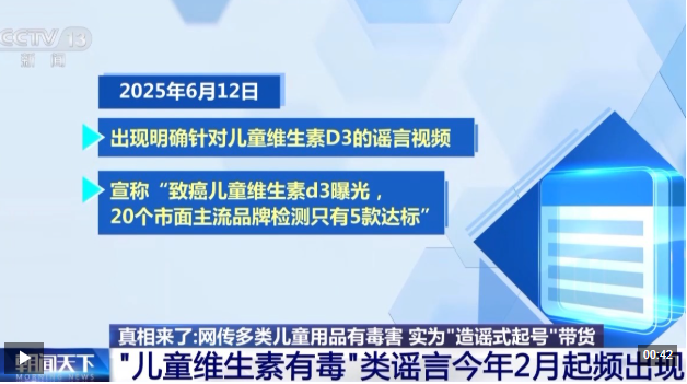 2025年6月12日,网上出现明确针对儿童维生素D3的谣言视频,宣称“致癌儿童维生素D3曝光,20个市面主流品牌检测只有5款达标”。此后9—11月,这类谣言进入爆发期,比如9月23日有视频称“维生素D3含大量一级致癌物、有害物质超30倍”;10—11月更是涌现出“覆盖90%家庭”“工业垃圾做原料”“超标40倍”等五花八门的版本。