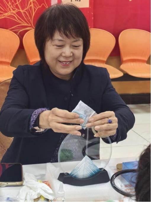 动手实操环节中,大家精心挑选自己喜欢的彩砂颜色,在老师的指导下,一步步完成堆叠、注胶、晃动等工序,任由细沙在方寸之间缓缓流淌,形成一幅幅动人画面:有的如远山含黛,意境悠远;有的似湖光潋滟,清新灵动。一双双巧手在时光中轻盈起舞,一件件充满个性的流沙画作品渐次成型。从起初的生疏试探,到逐渐熟练操作,从“手工新手”变身“流沙巧匠”,大家在创作中体验到成就与喜悦,活动室内充满了自豪的笑声与温暖的交流。
