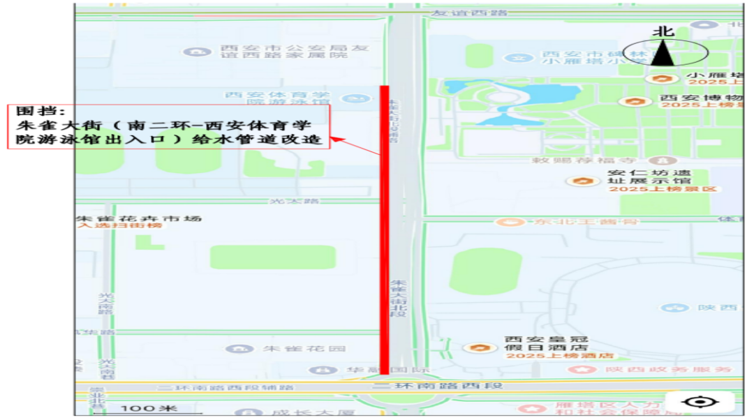 朱雀大街(二环南路至西安体育学院段)给水工程施工将于近期实施,届时将对相关路段交通组织进行临时调整,现将施工期间交通管理工作通告如下:
