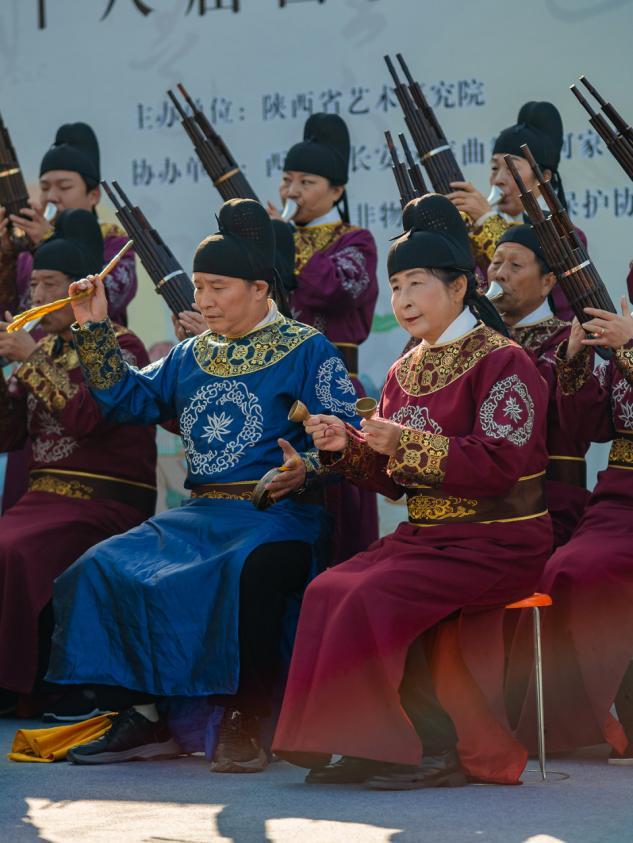 西安鼓乐作为列入人类非物质文化遗产代表作名录的非遗项目,是古都西安一张亮丽的文化名片。上午10:30,“千年鼓韵·盛世启章”专场演出如期上演,何家营鼓乐社率先登场,带来坐乐《将军令》《普天乐》、唐诗吟唱《忆江南》及双云锣《尺调引令》,都城隍庙鼓乐社、大吉昌鼓乐社的《步步娇》《尺调耍鼓段坐乐》《十六拍》等传统曲目,古朴旋律与诗意吟唱交织,尽显千年鼓乐的典雅韵味。据了解,本次展演全程摄像记录,后续将制作主题视频、花絮及宣传片,助力西安鼓乐的广泛传播。