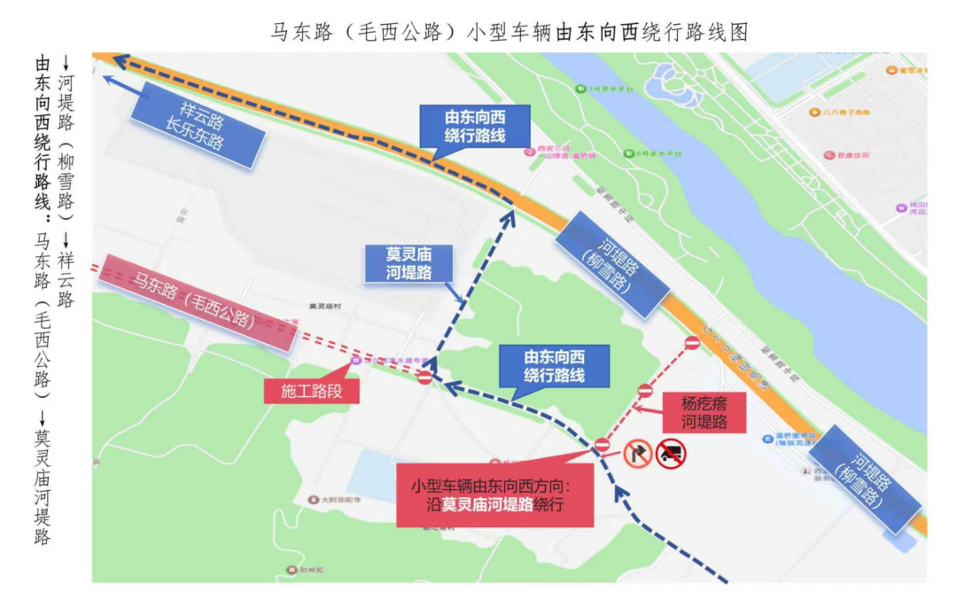 2.由东向西绕行路线:马东路(毛西公路) → 莫灵庙河堤路 → 河堤路(柳雪路) → 祥云路,大型车辆禁止通行。