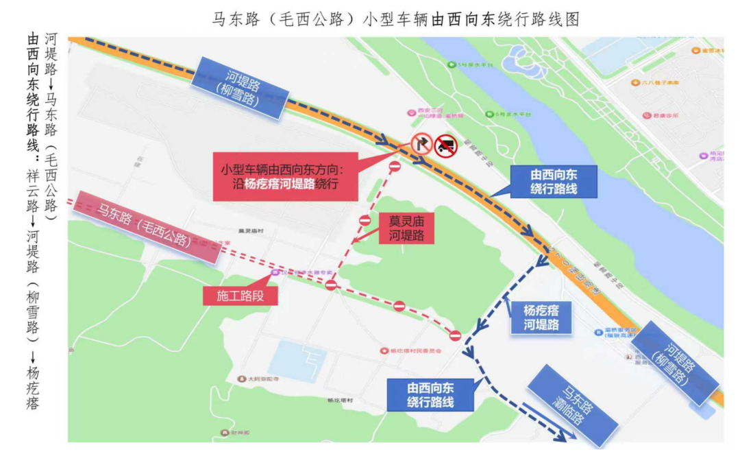 近日 灞桥区席王街道办事处 西安市灞桥区交通运输局 发布施工路段封闭交通事项公告 具体内容如下 灞桥区2025年马东路(毛西公路)养护工程将于近期组织施工,为确保工程顺利实施和道路交通安全畅通,现就施工路段封闭交通事项公告如下: 交通管制路段:祥云路与马东路(毛西公路)路口至马东路 (毛西公路) 与莫灵庙河堤路交叉口。 交通管制时限:2025年11月24日—2026年1月23日。 交通管制措施:交通管制期间全封闭施工,除施工车辆外禁止一切社会车辆通行。 施工期间,请过往的车辆、行人注意观察安全警示标志、标牌,自觉服从交警和现场疏导员的指挥,维护交通秩序,确保安全通行(特殊情况临时解除管制将另行通知)。 对违反本通告规定的车辆,由公安机关交通管理部门按照《中华人民共和国道路交通安全法》及相关法律法规进行处罚。 小型车辆绕行路线: 1.由西向东绕行路线:祥云路→ 河堤路 (柳雪路) → 杨疙瘩河堤路 → 马东路(毛西公路) 2.由东向西绕行路线:马东路(毛西公路) → 莫灵庙河堤路 → 河堤路(柳雪路) → 祥云路,大型车辆禁止通行。 因此给您出行带来的不便深表歉意,敬请谅解与支持。 灞桥区席王街道办事处 西安市灞桥区交通运输局 2025年11月19日 马东路(毛西公路) 小型车辆由东向西绕行路线图 马东路(毛西公路) 小型车辆由西向东绕行路线图