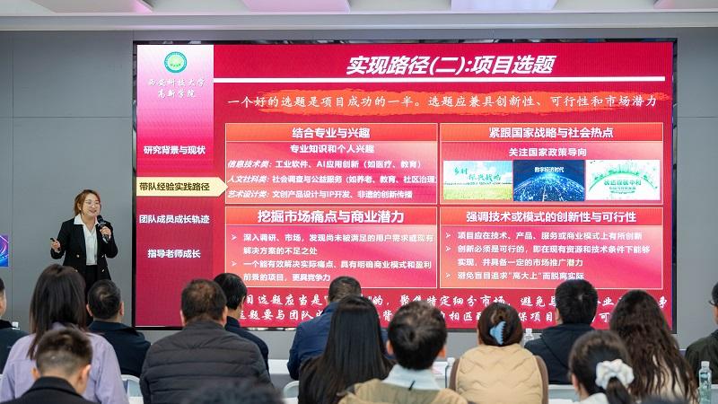 第十九届“挑战杯”国赛三等奖指导老师李华君为在场师生带来一场干货满满的分享。其获奖项目以“特色产业融合助推县域经济高质量发展”为主题,聚焦陕南3市11县茶产区,组建跨工程造价、视觉传达、网络与新媒体、计算机等多学科团队,历经三年深入调研,从产品、技术、文化、系统四个维度推动茶产业升级:在产品上融合安康富硒茶与泾阳茯茶工艺,研发出金花菌更丰富、健康价值更高的富硒茯茶;在技术上设计新型自动控温控湿发花装置,实现降本增效与发花均匀;在文化上挖掘“贡茶文化”“茶马古道”内涵,打造特色文创包装;在系统上运用全生命周期成本管理方法优化茶产业园区建设,并构建“内容+技术+渠道”立体传播矩阵扩大品牌影响。该项目不仅为地方茶产业注入新活力,也构建了一套可复制、可推广的乡村振兴数字化解决方案。李华君老师从选题立意、细节打磨,到跨学科协作与团队心态管理,全面拆解竞赛关键环节,倾囊相授实战经验,为学生们搭建起从校园学习走向国赛舞台的坚实桥梁。