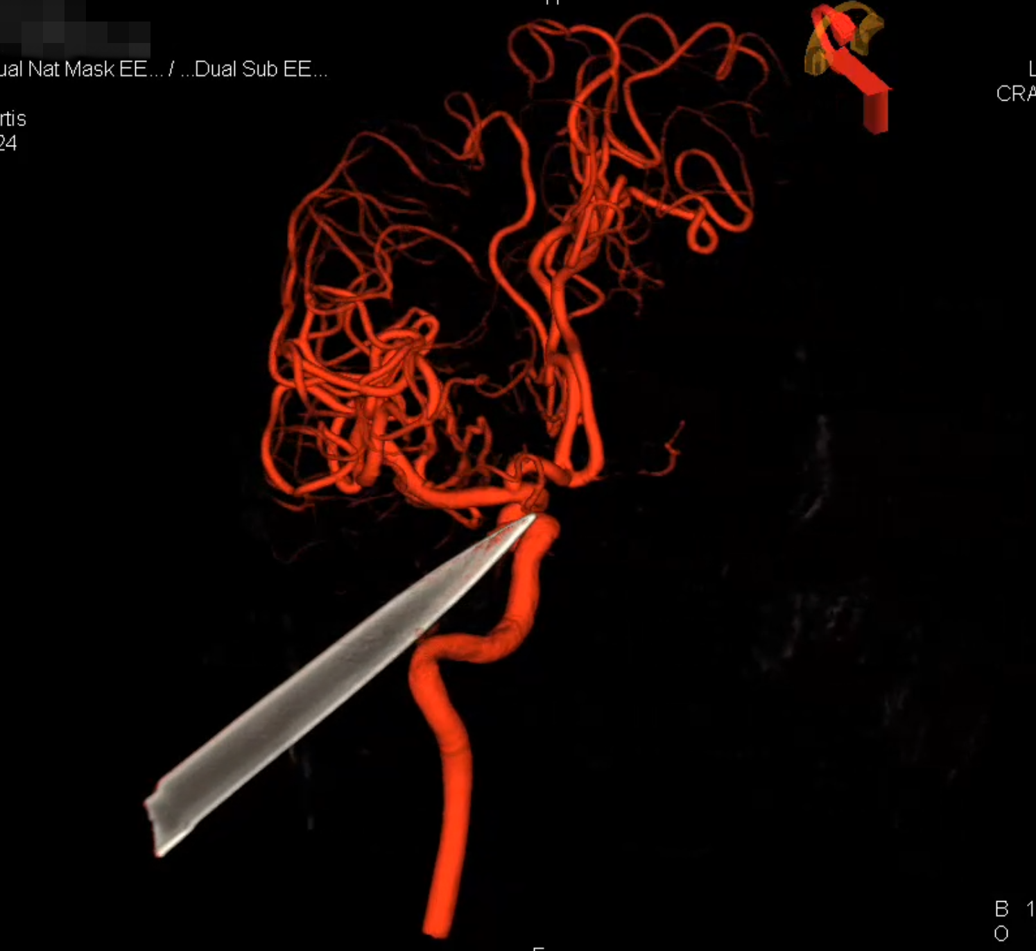 事发后,刘某被紧急送往唐都医院,医院第一时间将其转入神经外科创伤重症ICU。入院检查显示,异物从颞下窝经颅中窝底部进入颅腔,刀尖紧邻颈内动脉海绵窦段,一旦血管破裂将引发致命性大出血,同时可能伴随颅内血管、神经及颌面部组织损伤,病情危急。
