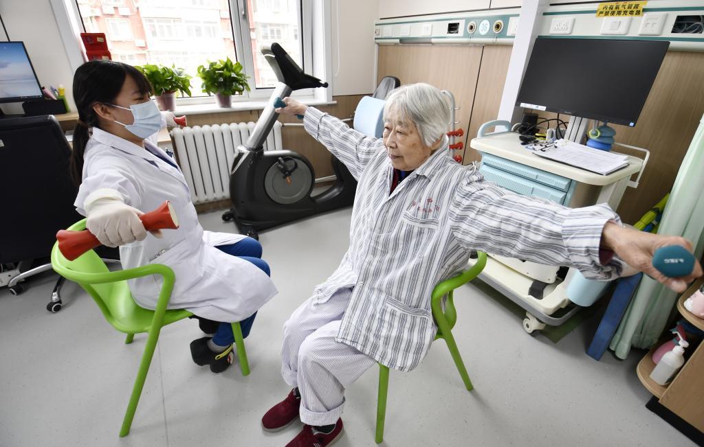 3月28日,一名老年居民在朝阳区安贞社区卫生服务中心的医务人员指导下进行康复训练。新华社记者 李欣 摄