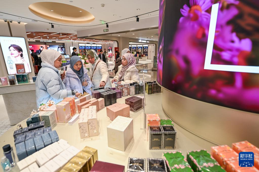 11月26日,来自马来西亚的游客在西安市内免税店免税商品区选购香水。新华社记者 邹竞一 摄