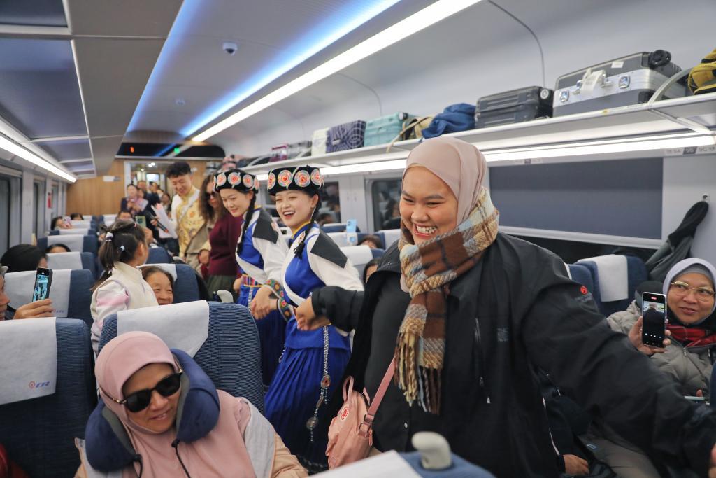 11月22日,在丽香铁路动车组列车上,东南亚游客与身着民族服饰的乘务员一同跳舞。新华社发(杨紫轩摄)