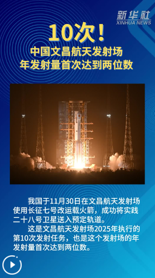这是文昌航天发射场2025年执行的第10次发射任务,也是这个发射场的年发射量首次达到两位数。