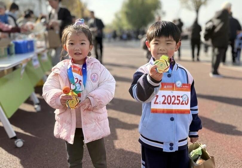 沿途的补给站和打卡点充满童趣:加油口号牌迎风招展,医疗组备齐用品与温开水,孩子们或专注奔跑,或驻足拍照,在坚持与享受中体会运动的意义。大一班陈稼彤以25分57秒的成绩率先冲过全程终点,小二班毛郭锦榕则以21分20秒斩获半程第一。当孩子们从老师手中接过奖牌时,骄傲与喜悦溢于言表,“我做到了!”成为现场最响亮的声音。