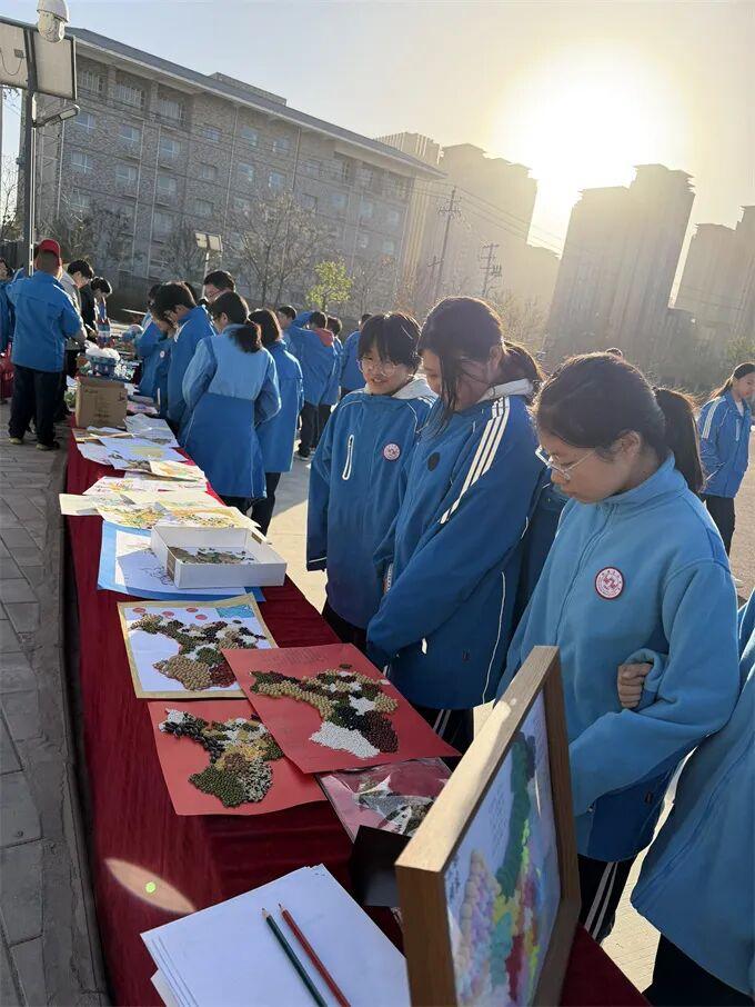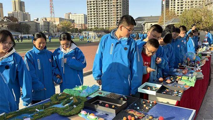 地理展区凸显学科融合与动手乐趣。初一学生制作的太阳系模型、地球仪、等高线地形图和中国地图创意十足,废旧材料与科技元素的巧妙结合,既展现了地理知识的严谨性,又体现了环保理念与创新思维。