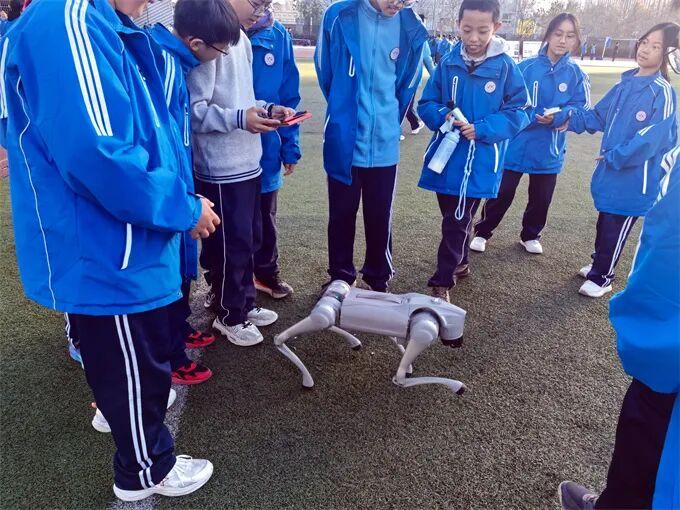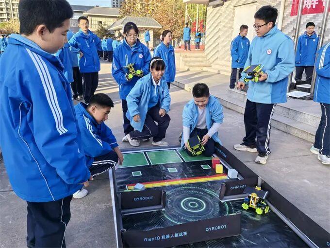 信息组的人工智能展区堪称全场焦点。学生积极参与机器狗互动,现场一片欢声笑语。初一学生发挥智慧和动手能力,设计、组装、编程多辆智能小车,让小车在赛道上进行比赛,“你”追“我”赶,展现科技的速度与激情。
