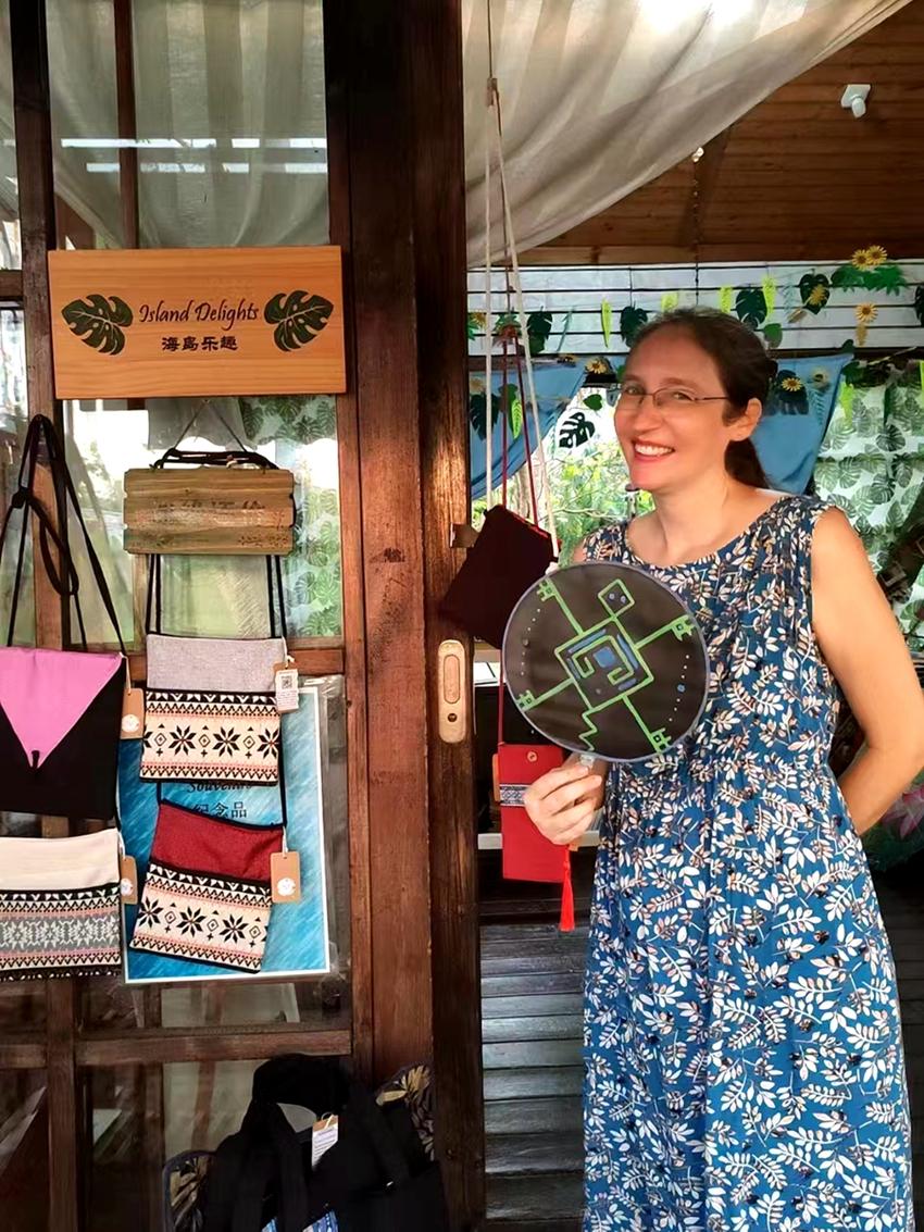 Nicki Johnson poses for a photo at the doorway of her handicraft shop "Island Delights" in Haikou, Hainan province. [Photo provided to China.org.cn]