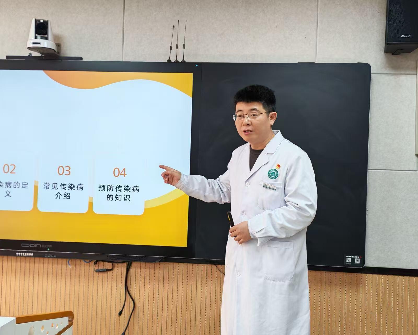 讲座中,曹超结合小学生的认知特点,用通俗易懂的语言和典型案例,系统讲解了流感、诺如病毒感染、水痘等冬季高发传染病的传播途径、典型症状及潜在危害。针对校园集体生活场景,他重点示范了七步洗手法的标准流程,详细讲解了科学佩戴口罩、保持教室通风、注意饮食卫生等关键防护措施,现场学生踊跃举手、积极作答,学习氛围浓厚。此外,曹超还结合自身健康副校长的职责,为师生补充了校园传染病应急处置的基础要点,提醒大家出现不适症状要及时报告就医。