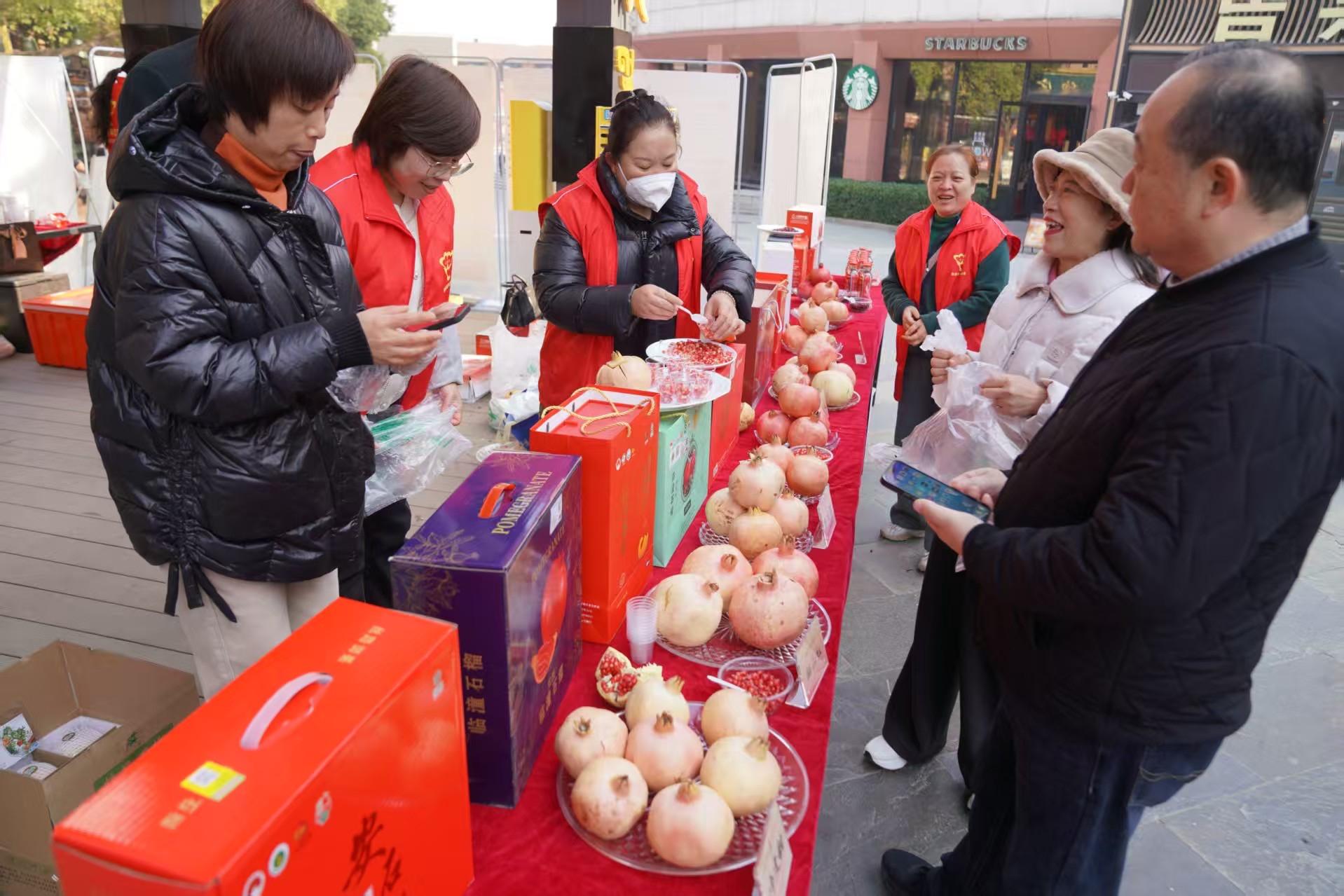 在冬日的暖阳下,这里展示的石榴、火晶柿子、板栗红薯等各类临潼特色农产品吸引着游客与市民驻足品鉴、选购。