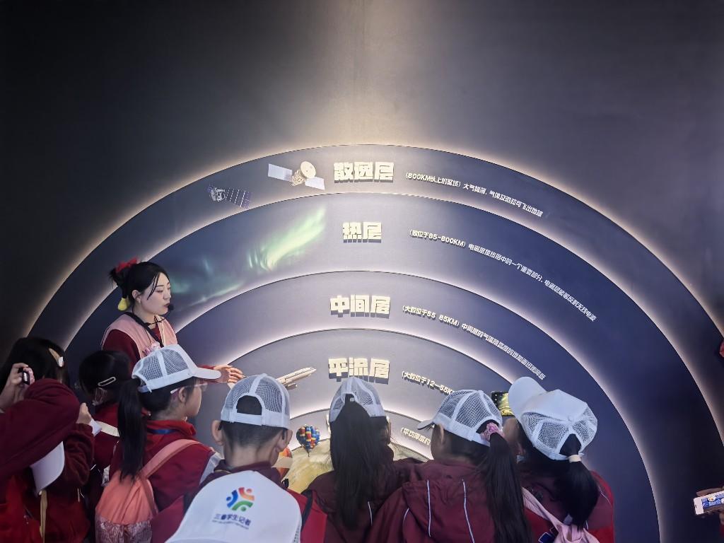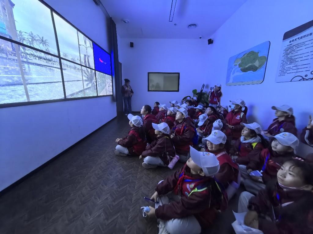 随后,学生们走进气象科技科普馆。龙卷风体验区让孩子们直观感受到自然力量的形态;在造云体验区,按下按键,水雾缭绕升腾,模拟出云朵生成的奇妙过程;当模拟台风场景中风声呼啸、灯光晃动时,惊叹声此起彼伏——“台风真来了!”“这也太真了吧,灯都掉了!”科学原理在沉浸式体验中变得生动而深刻。