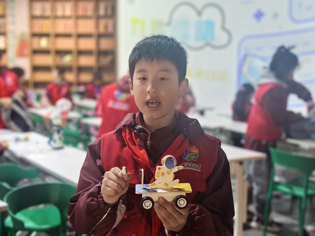 活动伊始,一堂“力量驱动——磁力小车大作战”手工实践课迅速点燃了孩子们的热情。在老师指导下,他们亲手制作宇航员磁力小车,探究磁力的奥秘。五年级11班王皓宇第一个展示完成的作品,向记者清晰地解释道:“它利用磁铁‘同性相斥、异性相吸’的原理,让小车动起来。”抽象的原理在实践中变得亲切可感。