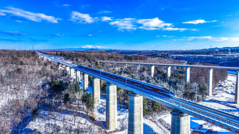 11月28日,沈佳高铁沈白段一列复兴号动车组列车穿过林海雪原。(陈明 摄)