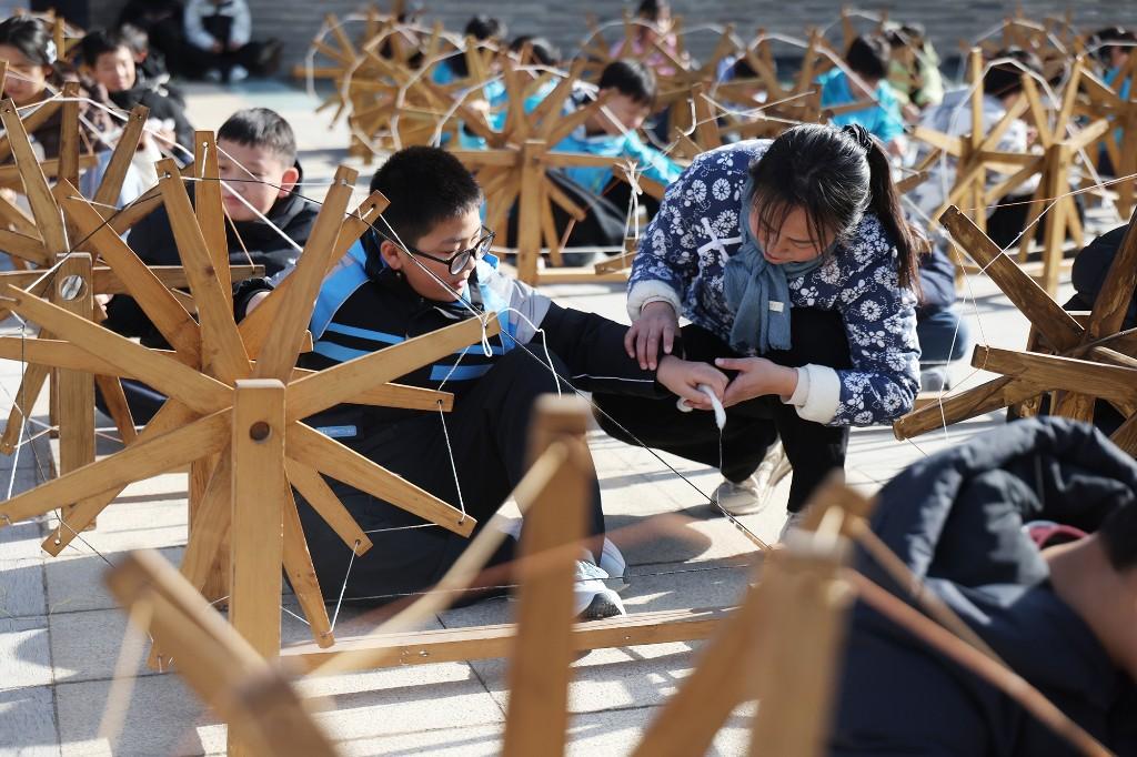 此外,学生们还体验了“纺线线”教学。在纺车前,他们亲手操作纺锤,将棉花纺成线。虽然动作略显笨拙,但眼神专注认真。通过亲手纺线,学生们深刻体会到革命先辈“自己动手、丰衣足食”的艰苦奋斗精神。七年级二班的张浩晨同学分享道:“今天体验了纺线线,我觉得能提升品格,磨炼专注力和意志力。”