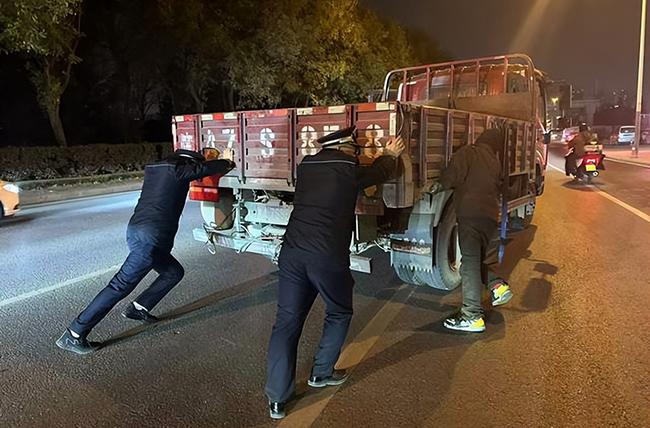 12月1日,北三环北道因一辆货车故障导致交通拥堵,过往车辆行驶缓慢。徐家湾中队队员袁松松、崔永军巡查发现后,迅速组织过往行人合力将货车推至路边安全地带,及时缓解交通压力,畅通的是路,暖的是人心。
