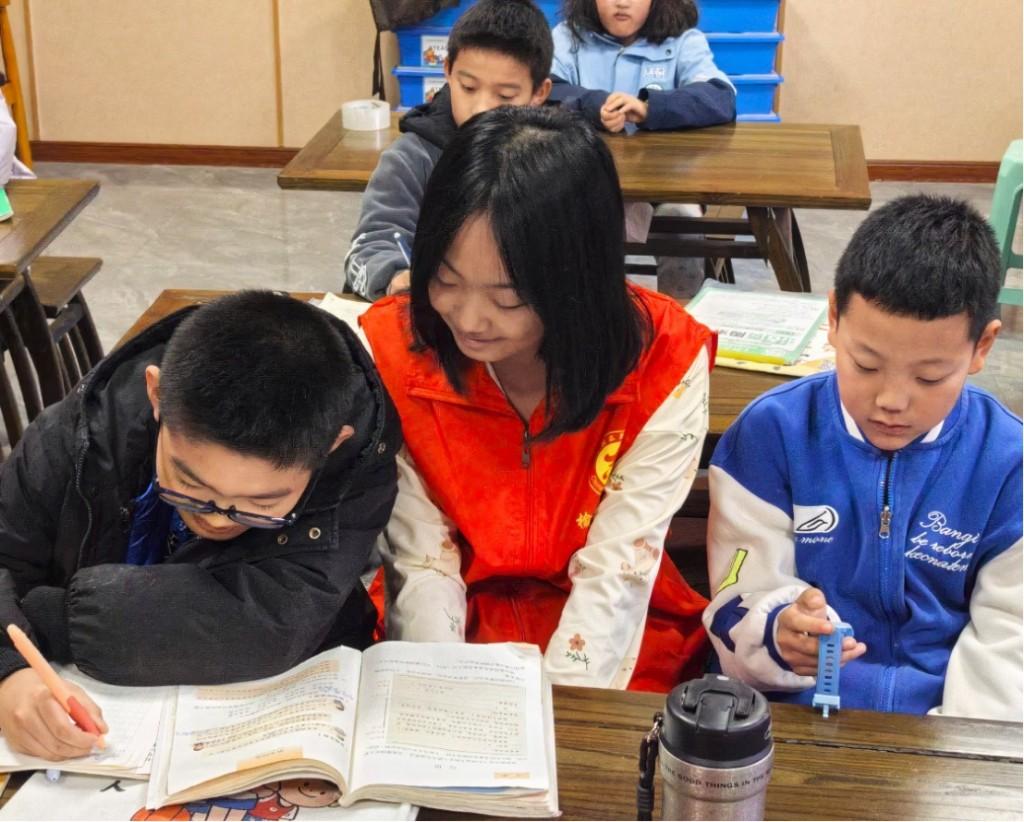 课堂分两个时段开展。下午2:00至3:30,面向一至三年级学生的“小小气象员”课程率先开讲。志愿者通过图文演示和趣味互动,引导孩子们认识气象符号、分辨常见天气变化,将抽象知识转化为生动体验。课后,志愿者随即转入“一对一作业辅导”环节,俯身倾听孩子困惑,细致讲解习题难点,耐心陪伴助力学习难题化解。