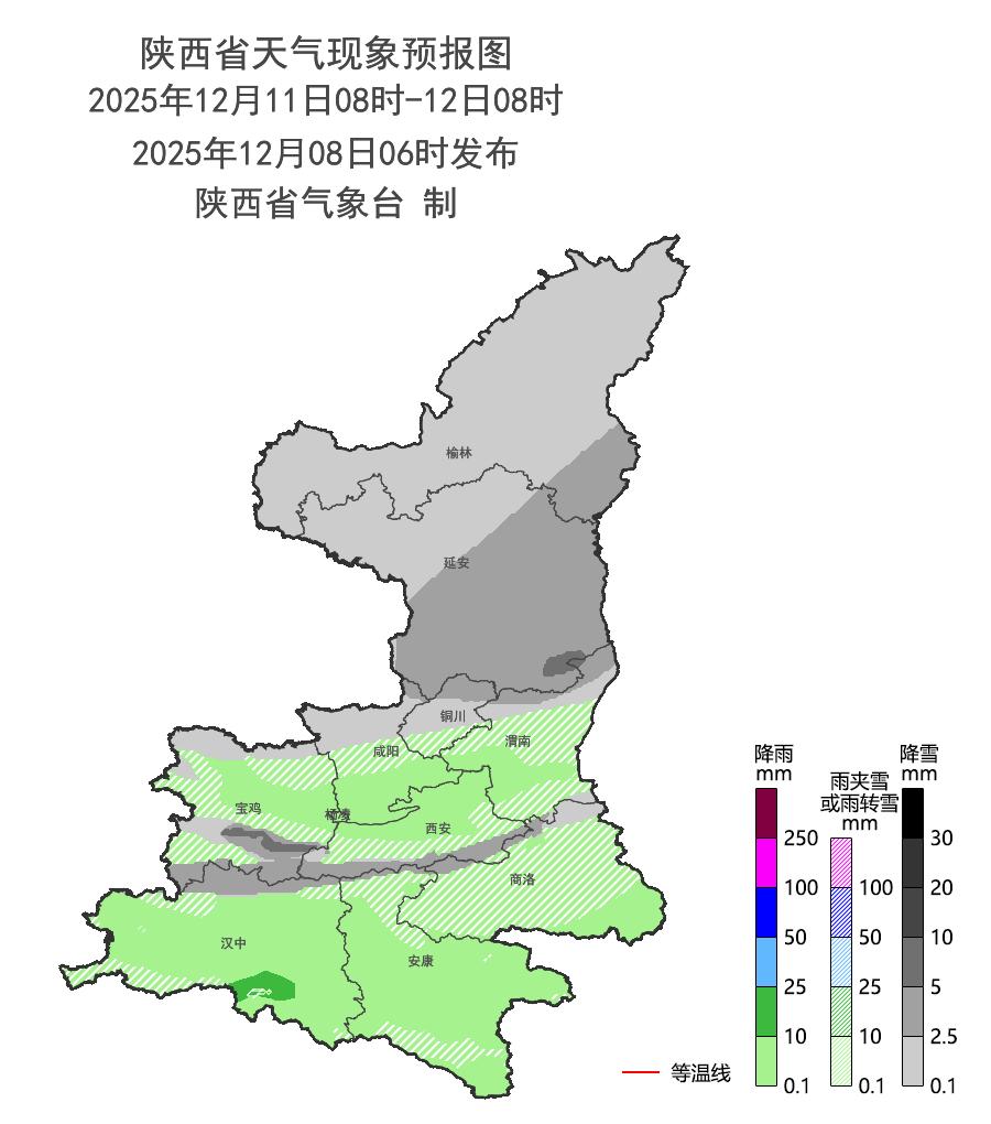 雨雪天气预报:12月11日:陕北小雨或雨夹雪转小到中雪(1毫米~5毫米),关中北部、秦岭山区小雨转雨夹雪或小到中雪(1毫米~5毫米),局地大雪(5毫米~7毫米),关中南部、陕南平原地带有小雨(0毫米~10毫米),局地有中雨(10毫米~15毫米)。12日:陕北、关中北部、秦巴山区西段小雪(0毫米~2毫米),秦巴山区东段部分地方中到大雪(3毫米~8毫米),局地暴雪(10毫米~15毫米),关中南部、陕南平原地带有小到中雨(2毫米~13毫米)。