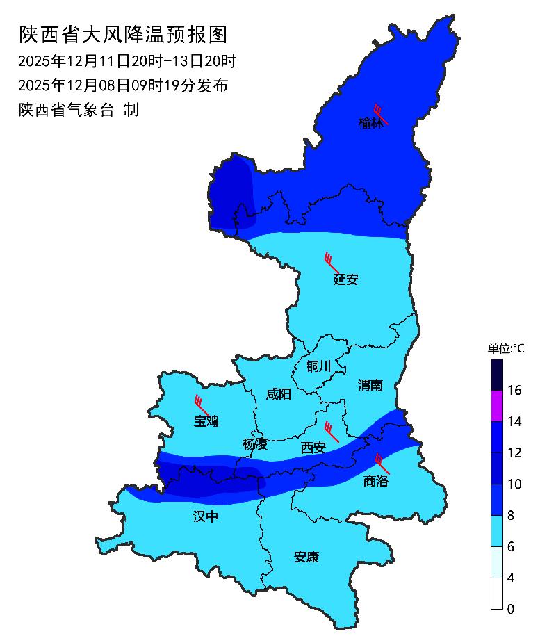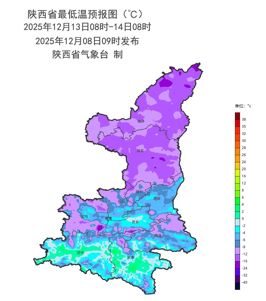 12月11日至13日过程日平均气温陕北北部、秦岭山区下降8℃~10℃,其中陕北西北部局地、秦岭山区西段可达10℃~12℃(可达寒潮),陕北南部、关中、陕南下降6℃~8℃。预计最低气温陕北、关中西部出现在13日清晨,关中东部、陕南出现在14日清晨:陕北、秦岭山区、宝鸡西部-14℃~-9℃,宝鸡东部、关中中东部、商洛-8℃~-4℃,汉中、安康-6℃~-4℃。