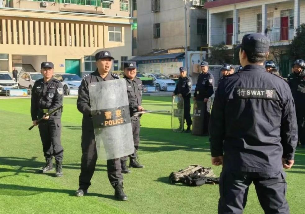 演练前,市级警务实战教官蔡磊结合校园安全实际,围绕器材使用、突发情况处置流程、师生疏散避险技巧等核心内容,为学校保安人员进行了详细讲解。从盾牌的防御姿势、钢叉的控制技巧,到预警方式、协同配合要点,民警通过理论阐释与实操示范相结合的方式,让保安人员快速掌握关键技能,确保在突发情况下能够科学应对、高效处置。