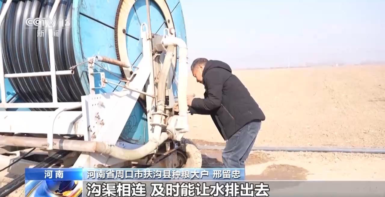 在河南周口扶沟县,种粮大户邢留忠正忙着给自家1000多亩小麦浇水,促进小麦萌芽。记者注意到,整片田块都被沟渠围了起来。