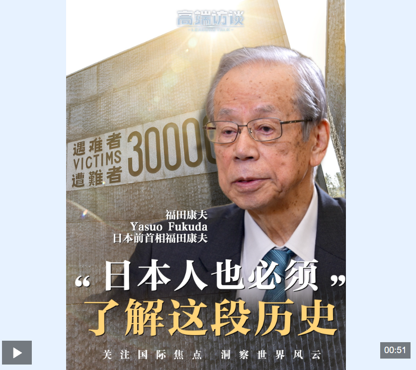 日本前首相福田康夫曾在2018年参观侵华日军南京大屠杀遇难同胞纪念馆,他是第四位参观的日本前首相。接受总台《高端访谈》专访时,他说,日本人也必须了解这段历史。
