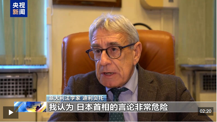 意大利法学家 迪利贝托:我认为日本首相的言论非常危险,换句话说,这是试图抹去一段不可能被抹去的历史记忆,其背后是一种民族主义,而且明显是错误的。除联合国宪章外,国家主权原则以及不干涉内政原则都是自国际法诞生以来就存在的原则,任何国家试图干涉他国内政都是极其严重的行为,最后我要说,世界上并不存在所谓的“两个中国”。