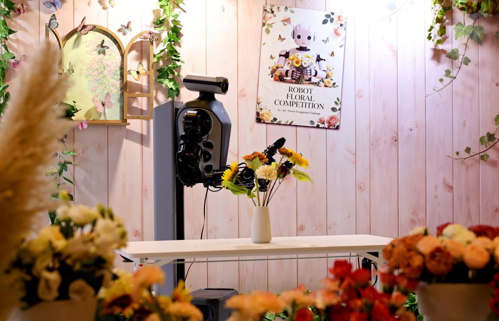 在2025全球开发者先锋大会暨国际具身智能技能大赛上,机器人在插花竞技场内移动。新华社记者方喆摄