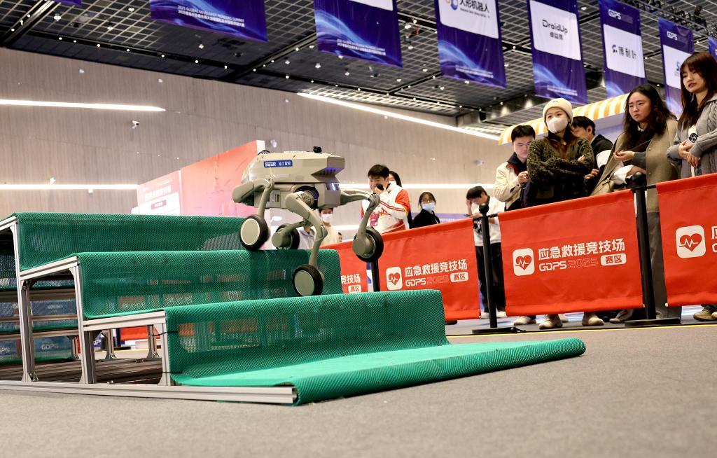 在2025全球开发者先锋大会暨国际具身智能技能大赛上,轮式机器人在应急救援竞技场演示快速爬楼梯技能。新华社记者方喆摄