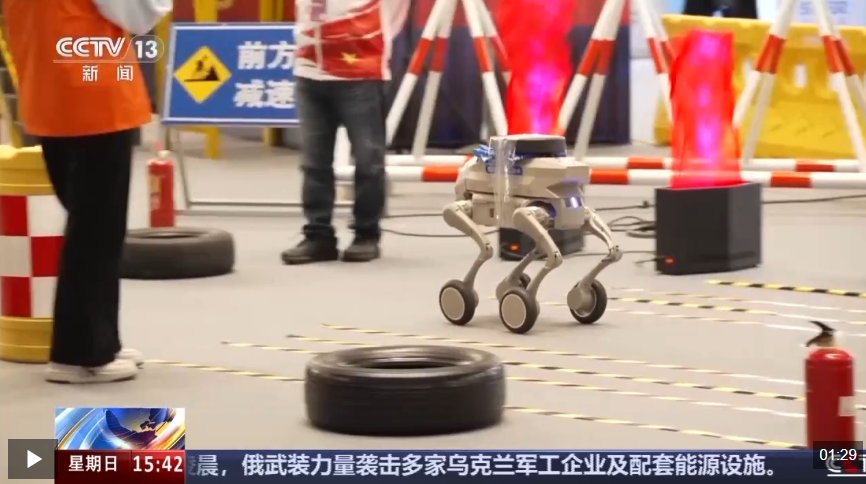 跨越30厘米高的碎石堆,攀上25厘米高的台阶,这只四足机器狗装载着数十公斤的“救援物资”,穿梭在模拟火场与灾区的赛道上。