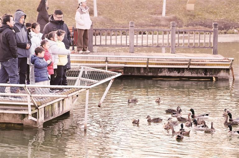 12月14日,在西安浐灞国家湿地公园,鸭子等悠然游弋,市民有的手持食物投喂,有的专注观赏,绘就了一幅温馨和谐的自然画卷。