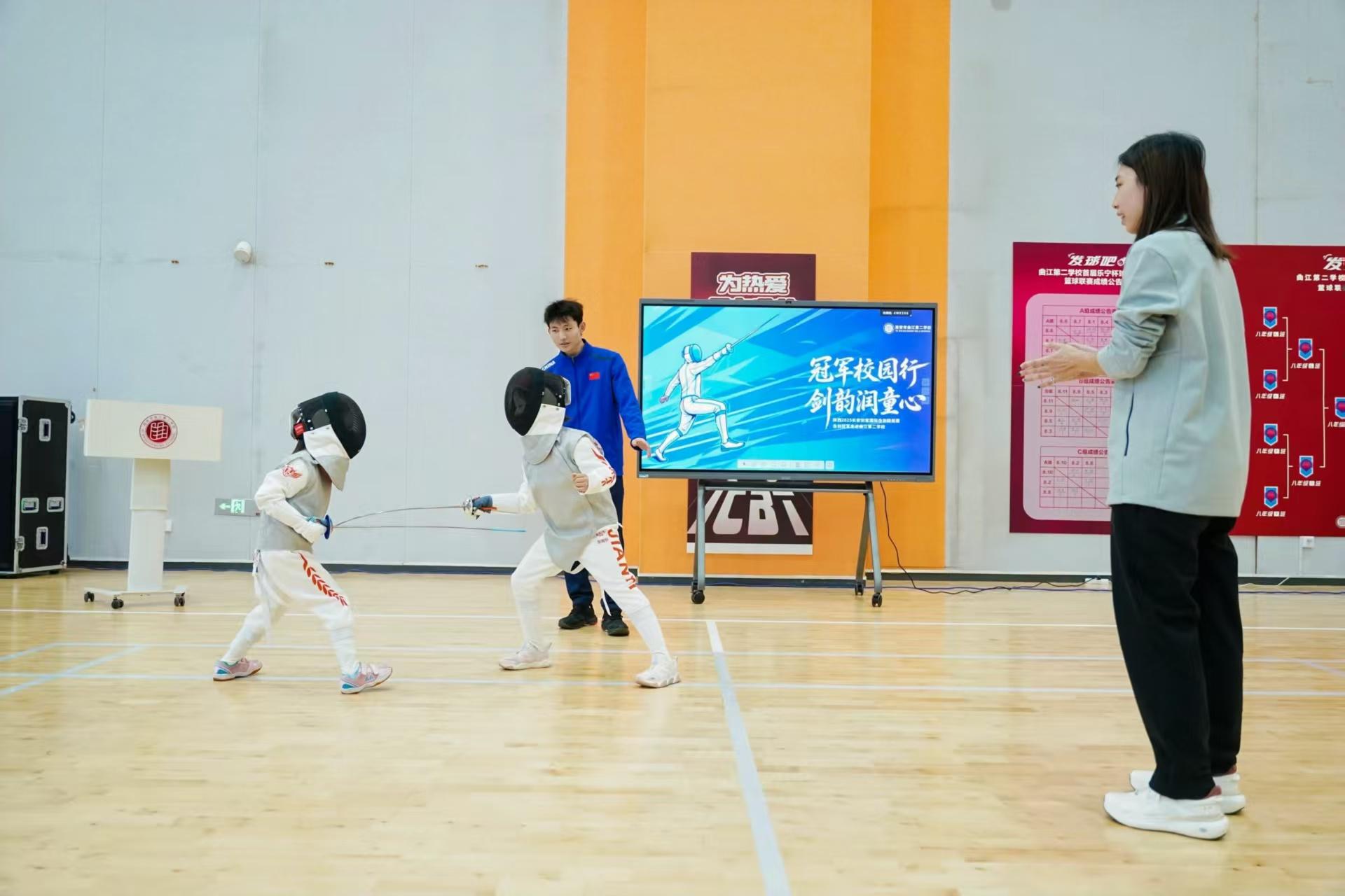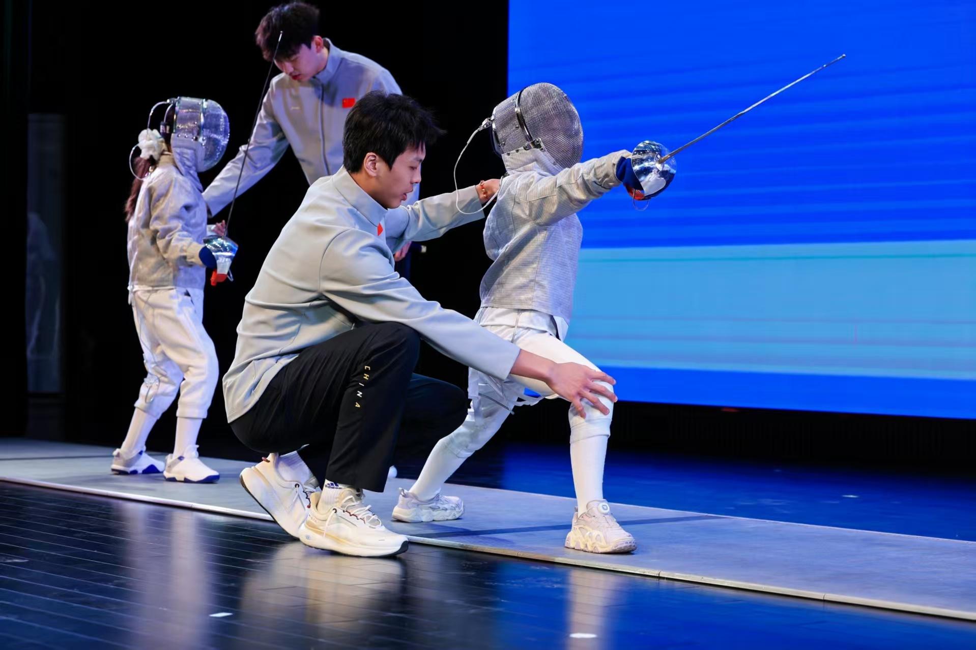 两组青少年佩剑运动员身着专业装备登场,进行了一场实战对抗,小运动员的每一个动作都精准利落、极具美感,生动诠释了击剑运动的优雅与激情。冠军运动员为大家进行讲解,台下师生目不转睛、掌声雷动,沉浸式感受着击剑运动的独特魅力。