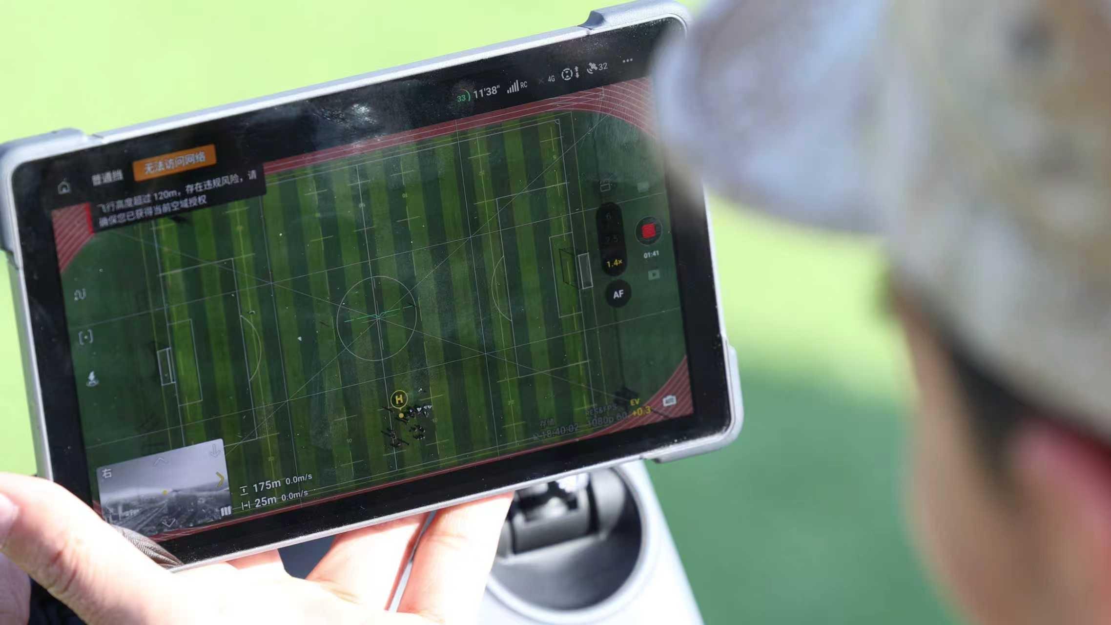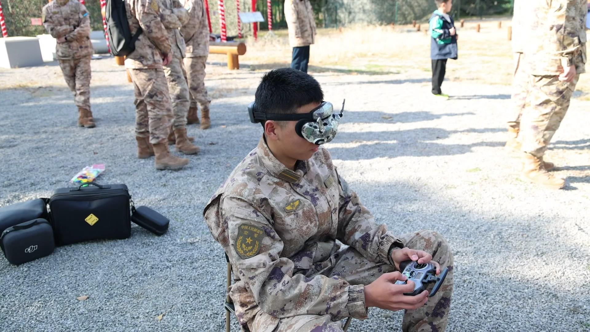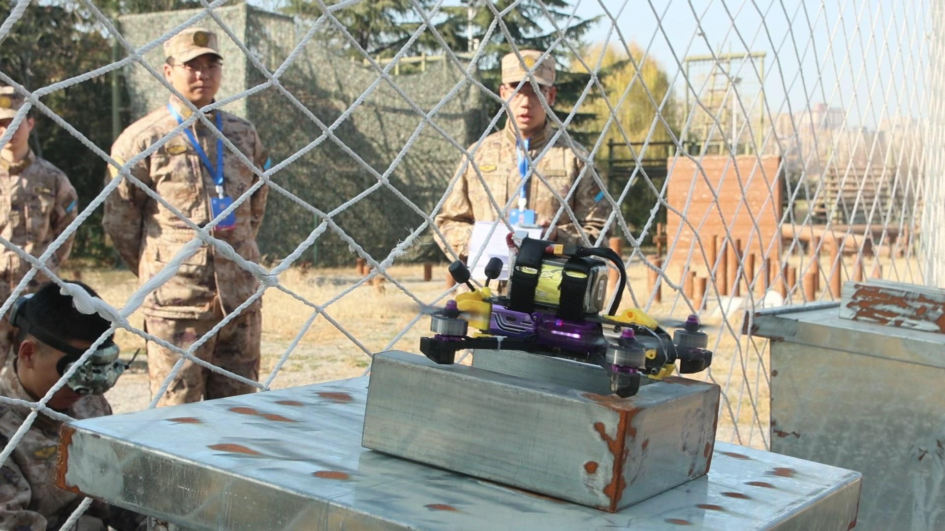 实飞赛场对抗更为激烈。在第一综合训练场,多支参赛队操纵四旋翼无人机展开“足球对抗”。该课目模拟限定空域内的战术攻防,突出小队协同、战术设计与临机配合。另一侧,穿越机高速穿越障碍、精准打击目标,着重检验单平台敏捷突防与精确打击能力。值得一提的是,部分负责组织协调的骨干学员也同时作为参赛队员投入比拼,体现了军校学员“指技合一”的培养要求。