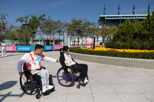 香港马鞍山体育馆外,梁绍颖帮顾文茜推轮椅。