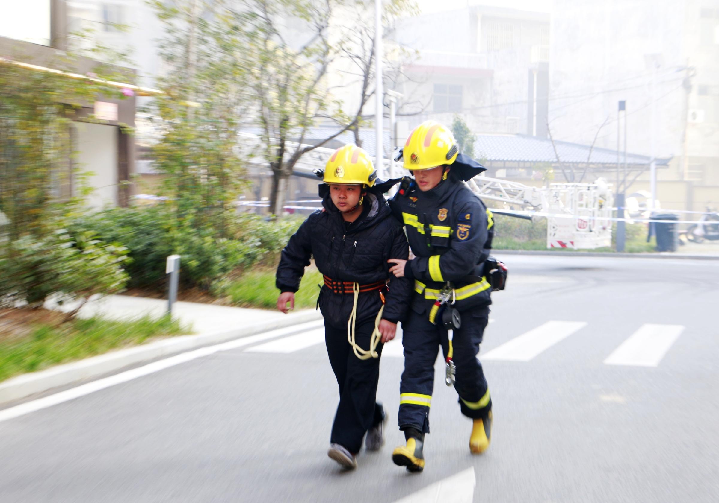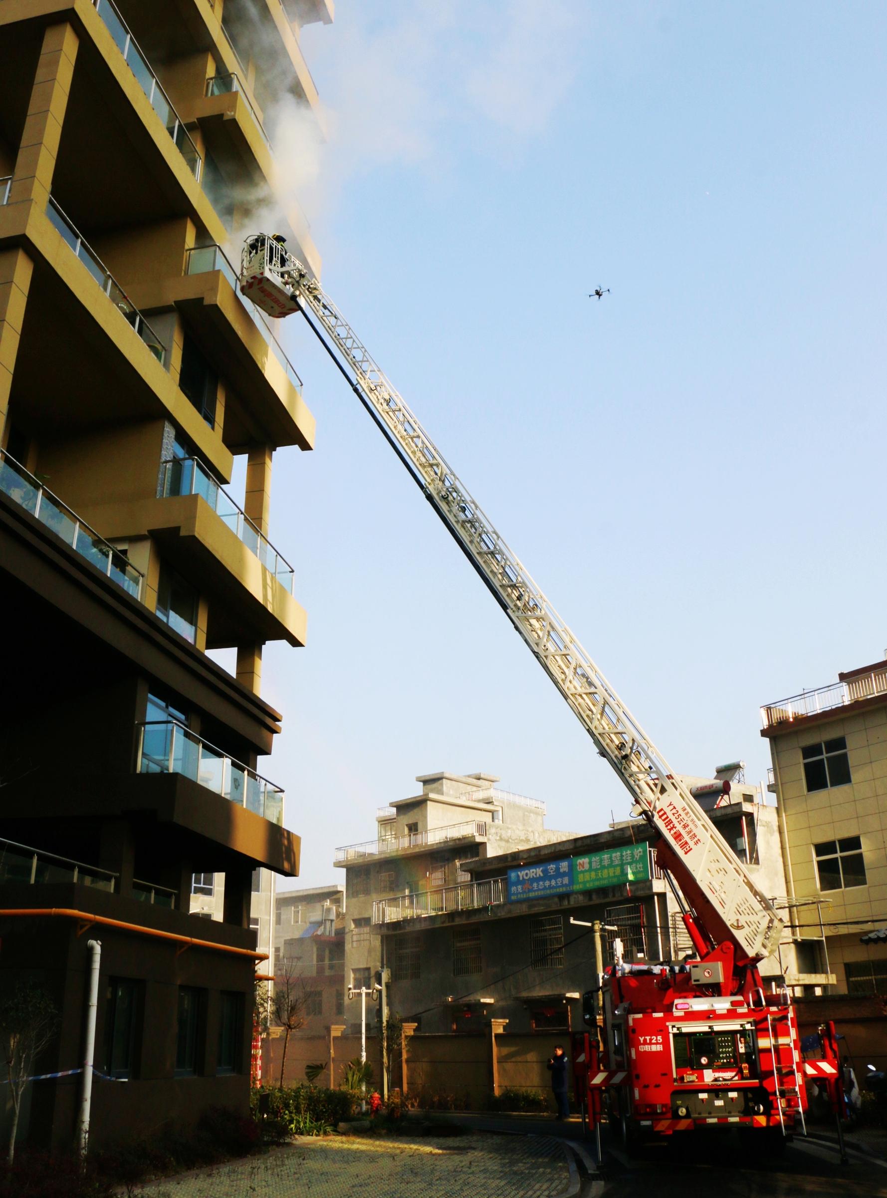演练模拟小区某高层建筑因电气线路故障引发火灾,火势迅速蔓延,并有人员被困。消防救援人员迅速架设云梯、铺设水带,构建立体供水体系压制火势。