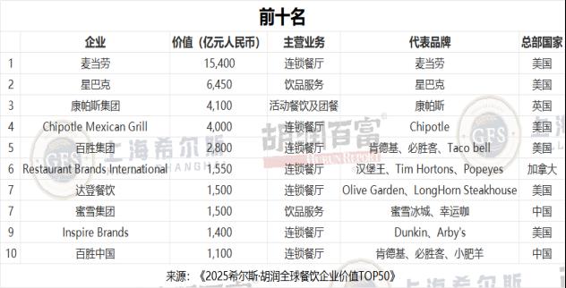 三秦都市报-三秦网讯(记者 任荣)12月15日,胡润研究院与希尔斯公司联合发布《2025希尔斯•胡润全球餐饮企业价值TOP50》,麦当劳成为全球餐饮行业最具价值企业,价值1.54万亿元人民币。星巴克以6,450亿元人民币的价值位列第二。美国上榜企业最多,有20家企业。中国位居第二,11家企业上榜。这是胡润研究院第四次发布餐饮行业榜单,同时也是首次发布全球范围的餐饮企业价值榜单。