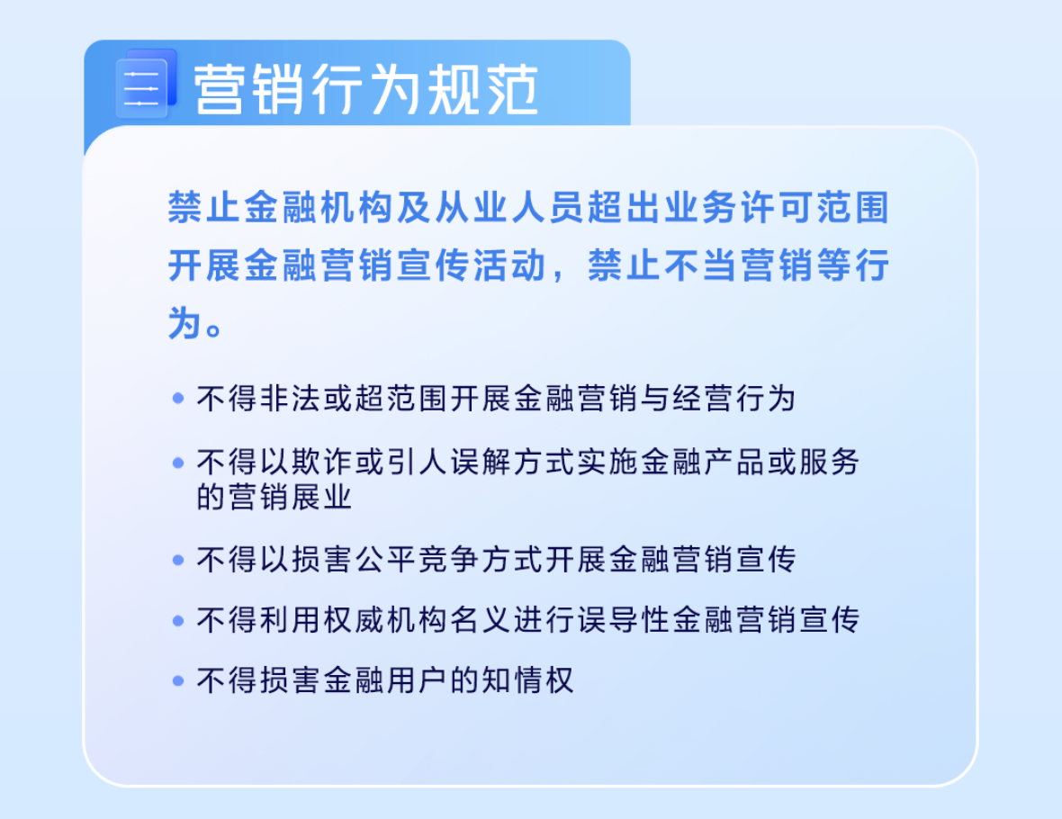 考虑到金融行业特定属性,《公约》对营销行为作出严格约束。《公约》要求金融机构及从业人员需具备合法资质并完成平台认证方可开展营销宣传活动,严禁非法或超范围经营;禁止以欺诈、引人误解的方式进行营销,明确不得虚假承诺收益、隐瞒限制条件;同时禁止通过不当评比、排序等方式进行宣传,不得利用权威机构名义进行误导性金融营销;强调营销过程需充分保障用户知情权,对风险信息进行显著提示。